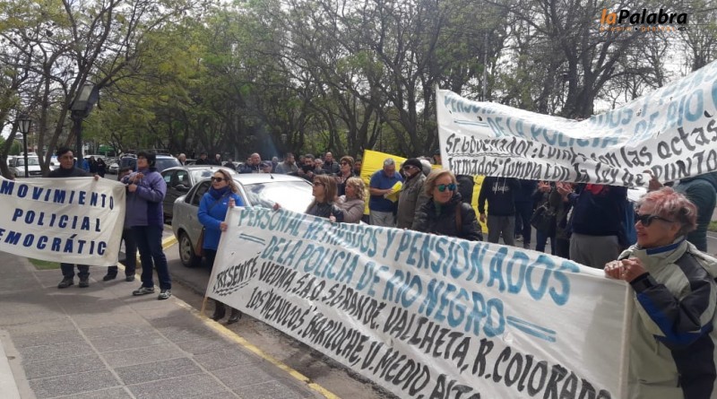 Hombres y mujeres retirados de la Policía de Río Negro se manifestaron hoy en Viedma en rechazó a la decisión del gobierno de implementar aumentos salariales al personal en activid...