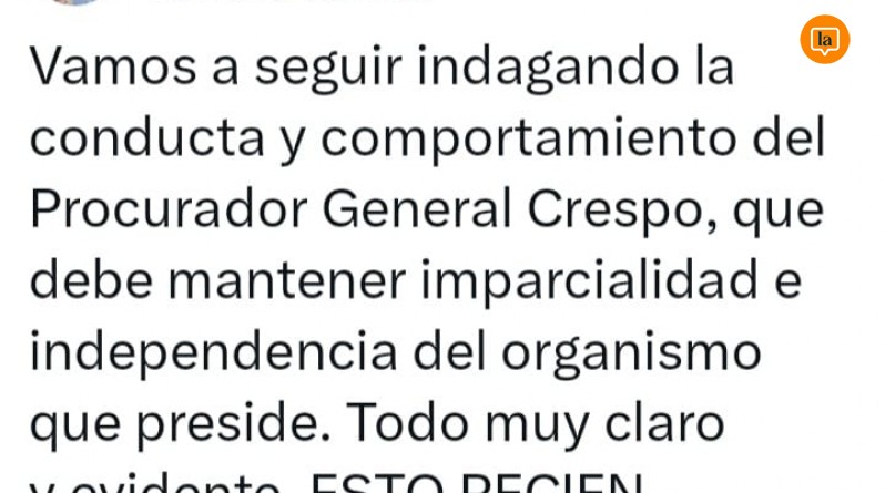 En otro mensaje, el legislador manifestó: “Vamos a seguir indagando la conducta y comportamiento del Procurador General Crespo, que debe mantener imparcialidad e independencia del organismo que preside. Todo muy claro y evidente. ESTO RECIÉN EMPIEZA”.