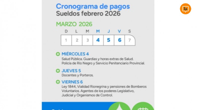 El Gobierno de Río Negro informó que los haberes correspondientes a febrero de 2026 para las y los agentes de la Administración Pública Provincial se abonarán entre el 4 y el 6 de marzo, de acuerdo al cronograma oficial difundido por el Ejecutivo.