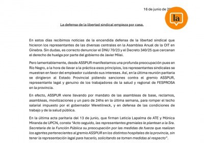 Asimismo sostuvo que “los compañeros del Hospital Zatti saben que no hay insumos y no hay presupuesto, esa es la realidad que tendría que estar denunciando el Gobernador y no estar diciendo que con ATE no hay diálogo. Seguramente va a ir buscando el diálogo con la gente que más le conviene”.