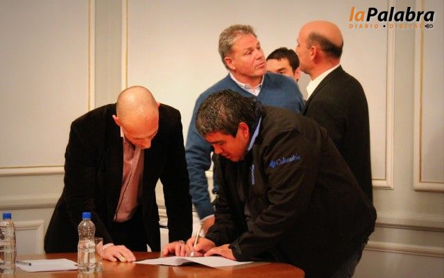 El Secretario General de UOCRA Seccional Viedma, Damián Miler, junto al Secretario de Organización, Juan Carlos Kolman, y el Colaborador Gremial, Marcos Aguilera, y d...