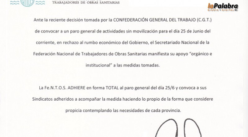 El Sindicato de Trabajadores de Saneamiento de Río Negro (SITSA) comunicó que adherirá al paro nacional convocado para el 25 de junio por la CGT.Igualmente desde la conducción grem...
