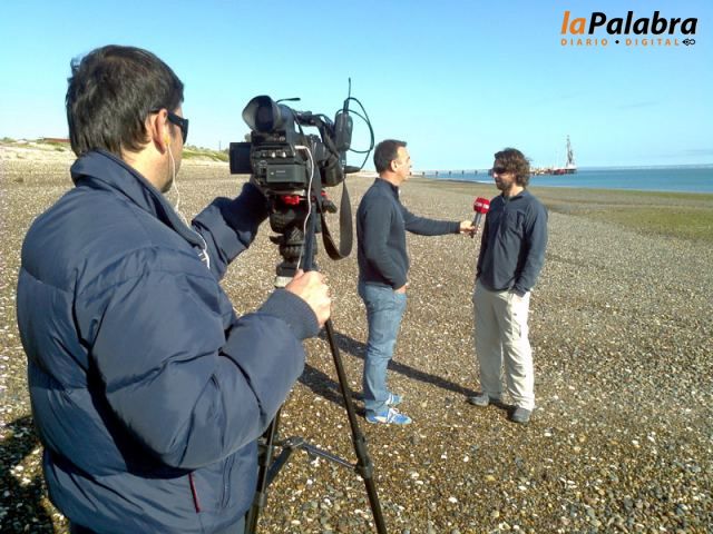 El periodista Luis Pavesio conductor del programa Alerta Verde y de piso del noticiero central junto a un camarógrafo del equipo de producción del canal