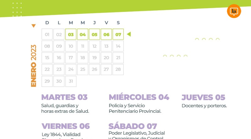 El pago de sueldos al personal del Estado Provincial comenzará el próximo martes 3 de enero con el depósito al sector de Salud, incluidas las horas extras y las guardias.El cronogr...
