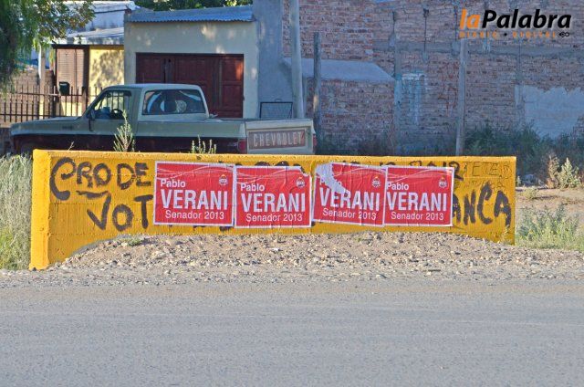 Afiches políticos referidos a las próximas elecciones parlamentarias que involucran al Senador Pablo Verani y otros de un circo instalado en Roca desde hace algunos d...