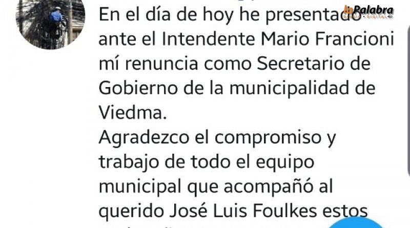 ayer renunció a la Secretaría de Gobierno de la capital rionegrina, opinó con