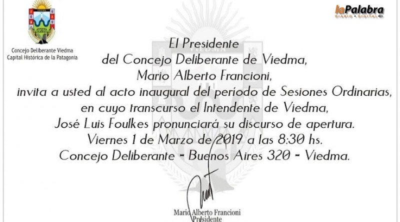 Mañana desde las 8.30 esta previsto que el intendente José Luis Foulkes concurra al Concejo Deliberante de Viedma para dejar inaugurado un nuevo periodo de sesiones ordinarias.&nbs...