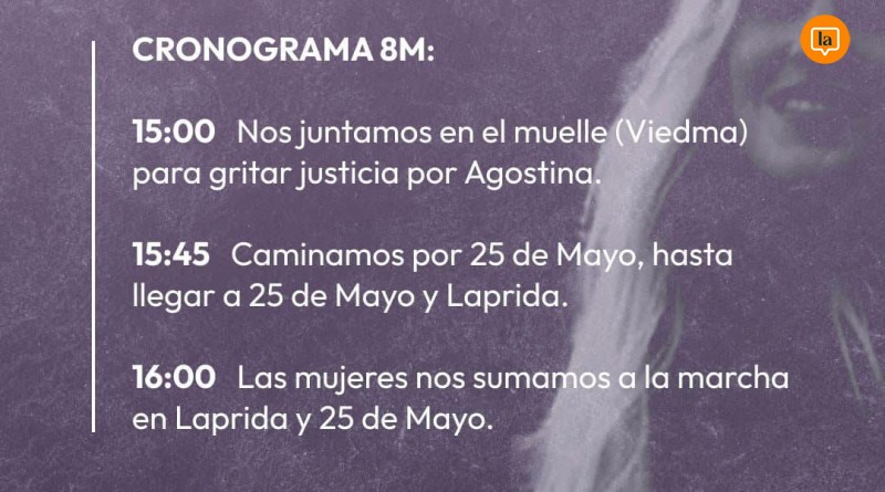 Este año, la movilización y paro por el Día Internacional de la Mujer trabajadora, sumará el lema "Todas somos Agostina", en relación con lo ocurrido con la joven oriunda de Carmen...