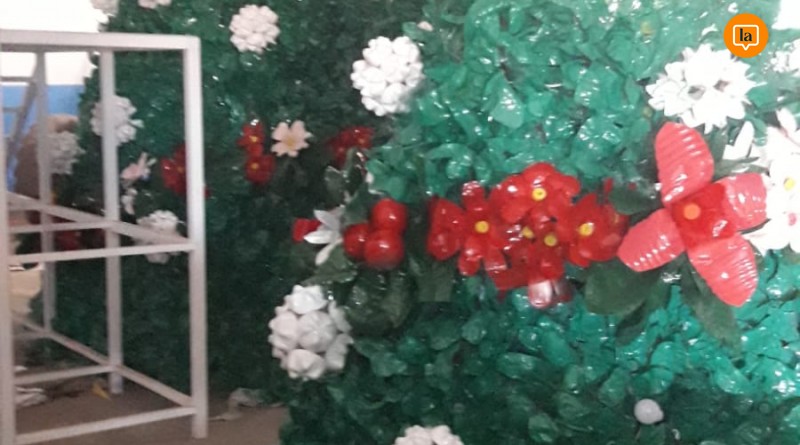 la confección de un árbol de Navidad con piezas recicladas de la basura. El