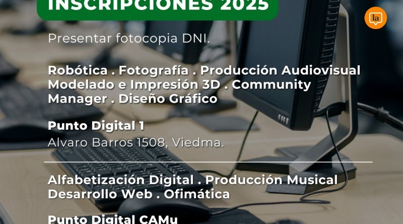 Las actividades se llevarán a cabo en los dos Puntos Digitales del municipio: uno ubicado en Álvaro Barros 1508 y otro en el barrio Camo. Según informaron desde la organización, los cursos tienen una duración de tres meses y están diseñados para brindar herramientas tanto para el uso cotidiano como para la inserción laboral.