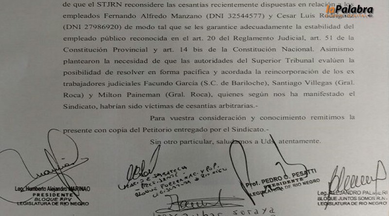 El titular de la Legislatura y los presidentes de los bloques parlamentarios solicitaron formalmente a los integrantes del Superior Tribunal de Justicia de Río Negro que "reconside...