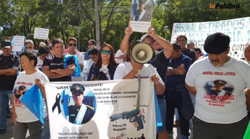 Familiares del oficial Lucas Muñoz asesinado en 2017 en Bariloche acompañaron hoy el reclamo de retirados y familiares de efectivos en actividad que recorrió las calles de la capit...