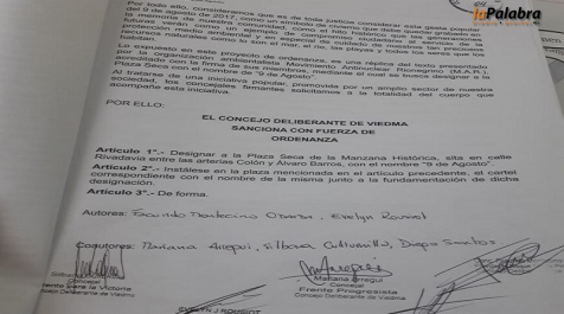 Por mayoría el Concejo Deliberante de Viedma rechazó el proyecto de ordenanza a través del cual se pretendía imponer el nombre 9 de Agosto a la nueva plaza seca que el municipio co...