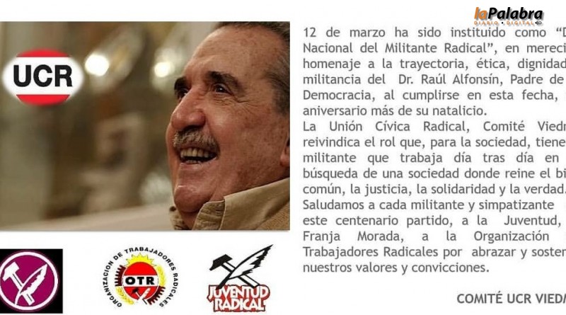 Al conmemorarse hoy el Día Nacional de Militante Radical desde el Comité Viedma reivindicaron "el rol que para la sociedad tiene el militante que trabaja día tras día en la búsqued...