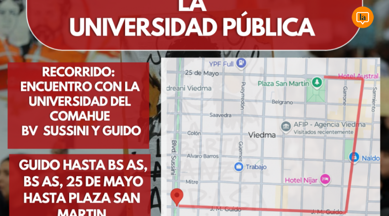 En la ciudad de Viedma, la Universidad Nacional de Río Negro (UNRN) y la Universidad Nacional del Comahue (UNCO) participarán de la marcha, comenzando desde distintos puntos de concentración, con un encuentro programado en la intersección de Guido y Boulevard Sussini cerca de las 17 horas. Desde allí, las y los manifestantes recorrerán las calles Guido y Buenos Aires hasta culminar en la Plaza San Martín.