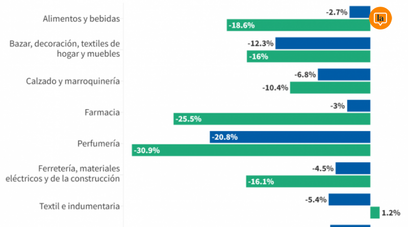 En cuanto a la caída por sectores, los siete rubros relevados registraron retrocesos interanuales. Las perfumerías fueron las más afectadas con una baja del 20,8%, seguidas por los sectores de bazar, decoración y textiles para el hogar, que experimentaron una disminución del 12,3%. En contraste, los alimentos y bebidas tuvieron una leve recuperación mensual, aunque mantienen una tendencia negativa en el acumulado del año.
