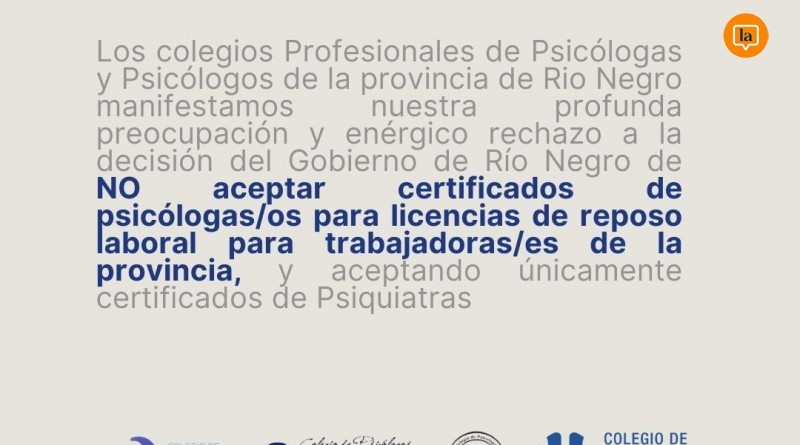 Los colegios profesionales de psicólogos de Río Negro expresaron su rechazo ante la reciente medida del Gobierno Provincial de no aceptar certificados emitidos por psicólogos para justificar licencias por reposo laboral. La normativa actual, que entró en vigencia en septiembre pasado, solo reconoce los certificados firmados por psiquiatras, lo que generó preocupación en los profesionales de la salud mental y un llamado a la revisión de esta decisión.