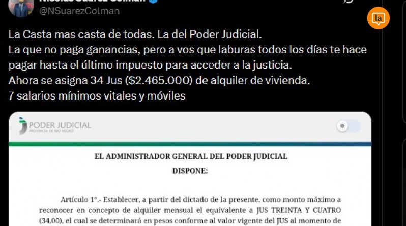 A partir de esa decisión administrativa, Suárez Colman difundió una opinión pública en la que expresó cuestionamientos al beneficio otorgado. En su planteo sostuvo: “La casta más casta de todas. La del Poder Judicial”. Además, señaló que mientras integrantes del Poder Judicial no tributan el impuesto a las Ganancias, el resto de la ciudadanía sí debe afrontar cargas impositivas para acceder al sistema de justicia.