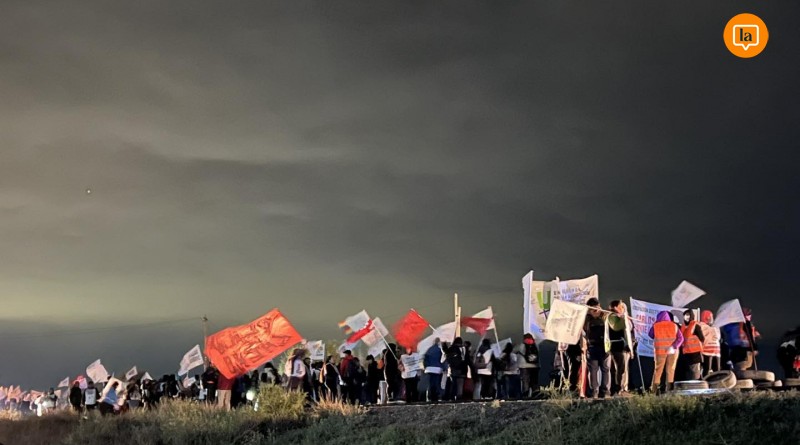 En el lugar trabajan efectivos de Gendarmería Nacional Argentina y de la Policía de Río Negro, que supervisan el operativo de tránsito y permanecen en la zona mientras se desarrolla la protesta.