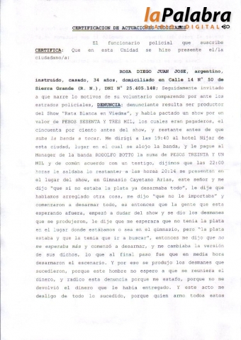 El joven empresario oriundo de Sierra Grande aseguró que Botto se llevó los 31.000 pesos abonados por adelantado, por lo que lo demandó, y remarcó la permanente mala voluntad del manager y de los integrantes de la banda en general.