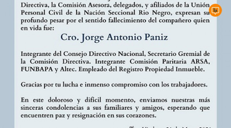 El secretario gremial de la Unión del Personal Civil de la Nación (UPCN), seccional Río Negro, Jorge Paniz, falleció esta tarde tras padecer COVID-19. El dirigente sindical e...