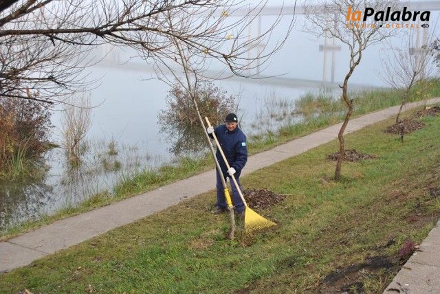 Seis agentes realizan la limpieza de la resaca y residuos acumulados por las diversas mareas, en el sector ubicado en inmediaciones del Puente Basilio Villarino y Prefectura Naval...