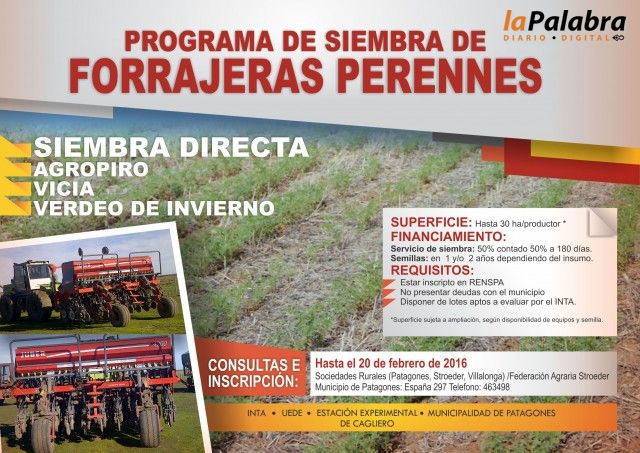 El plan financiará hasta 30 hectáreas por productor, incluyendo tarea de siembra y semilla de agropiro, vicio y verdeo de invierno, hasta cubrir un total de 2.000 hec...