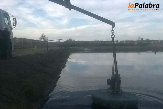 Personal de la firma rionegrina trabaja en el traslado de los aireadores de la laguna Nº4 hacia la laguna Nº1 de la planta depuradora.