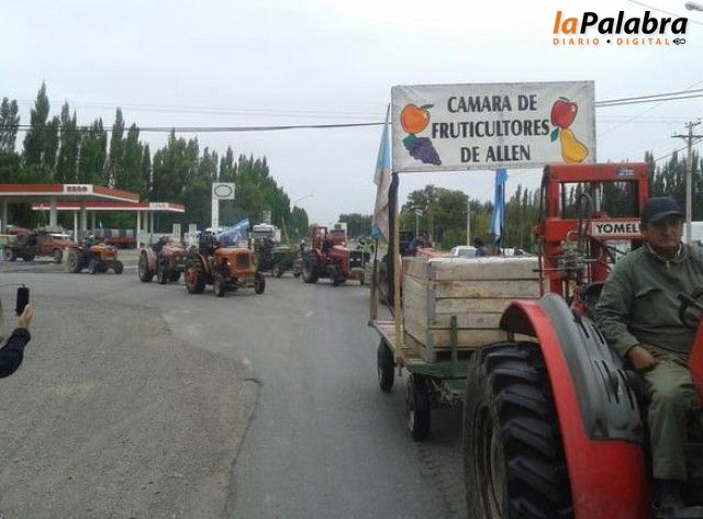 Desde Allen ya partieron aproximadamente unos 30 vehículos, entre tractores, camionetas y camiones que transportan bins con peras y manzanas que serán entregadas a la...