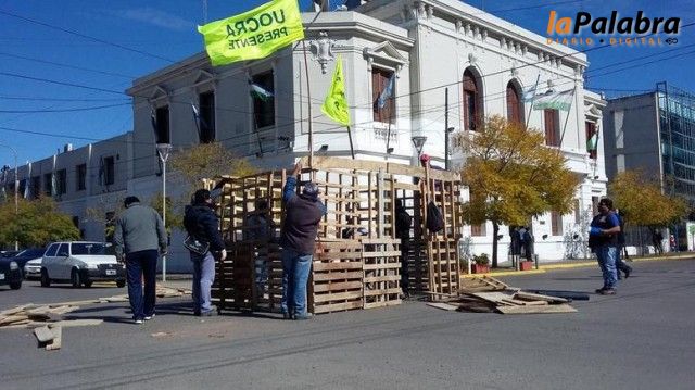Desde la UOCRA realizaron una protesta en las puertas de la Casa de Gobierno con la instalación de una casilla para exigir el inicio de obras ya licitadas y por la continui...