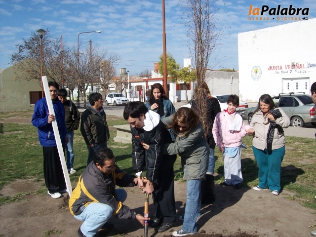 Los chicos participaron activamente de la colocación del ejemplar, acompañados por padres, docentes e integrantes de la Mutual.