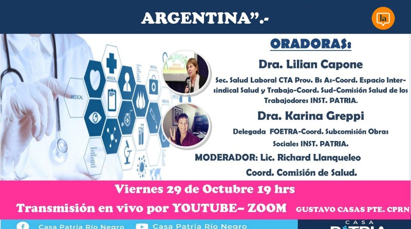 de octubre desde las 19, la Comisión de Salud de Casa Patria Río Negro llevará